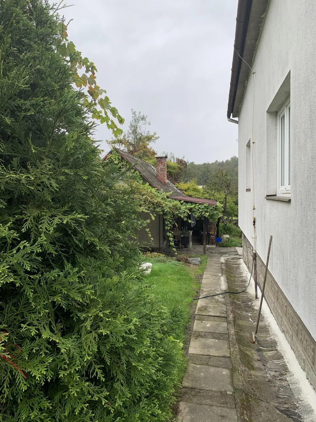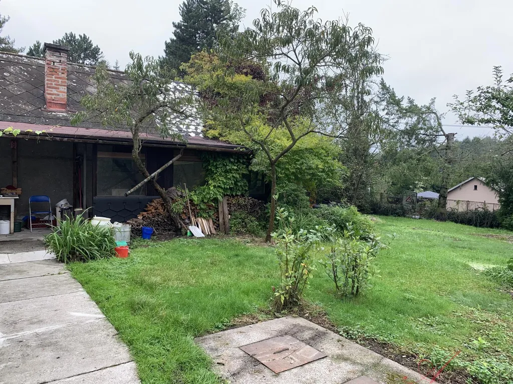Zahrada velká, oplocena. Hospodářská budova, dřevník, stromy, parkování.