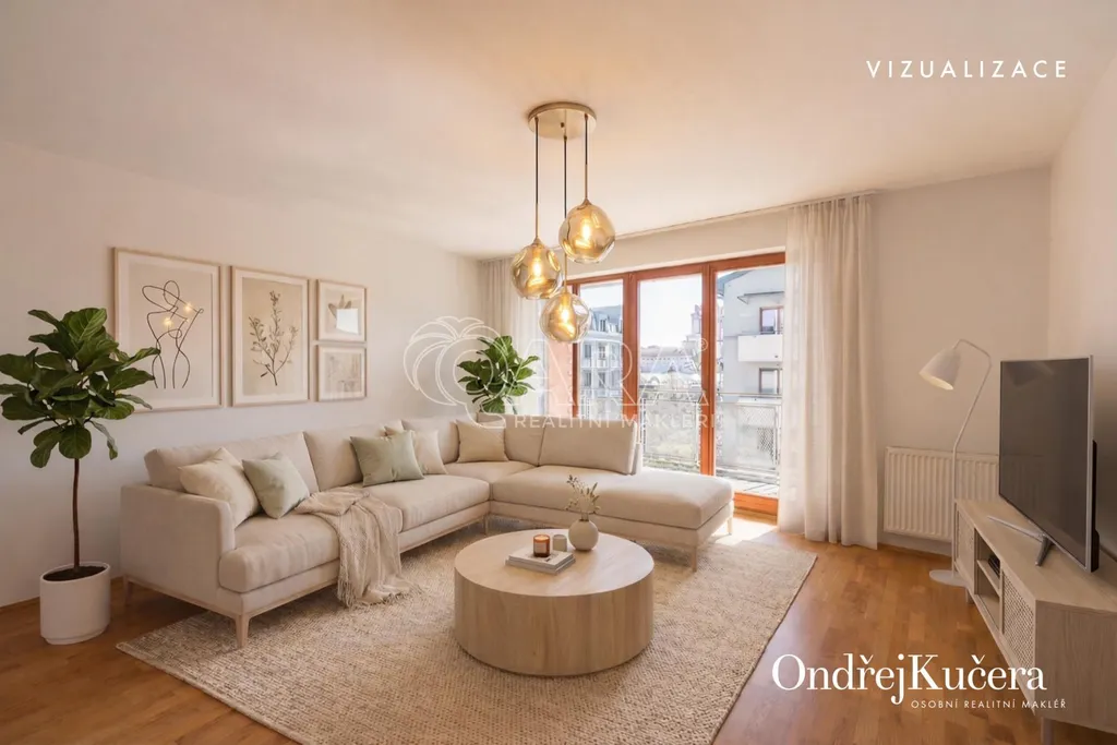Dispozice 2+kk s celkovou výměrou 66,25 m2 je řešena jednoduše a funkčně. Hlavní obytný prostor tvoří obývací pokoj s kuchyňským koutem, odkud se přímo vstupuje na prostorný balkon. Ten přirozeně rozšiřuje obytnou část bytu a v teplejších měsících může sloužit jako další místo pro práci nebo odpočinek. Samostatná ložnice nabízí dostatek soukromí i prostoru pro úložné řešení. Součástí bytu je dále koupelna s vanou a toaletou a praktická předsíň. K bytu náleží také sklep hned vedle garážového stání v domě, které je v této části Prahy praktickou výhodou.