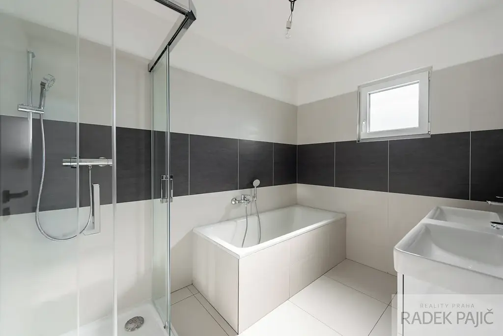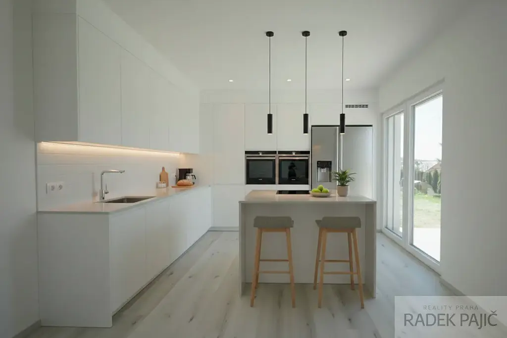 Samotná stavba byla realizována s důrazem na kvalitu a dlouhou životnost. Nosné zdivo z Porothermu, železobetonový monolitický strop i schodiště a kvalitní tepelná izolace zajišťují stabilitu, komfort i energetickou úspornost. (PENB "B") Střešní konstrukce s foukanou izolací o tloušťce 300 mm pomáhá držet příjemné klima v domě po celý rok. Interiér působí moderně a čistě – bezfalcové dveře, lepené vinylové podlahy v kombinaci s dlažbou a vkusně řešené koupelny s vybavením značek Laufen, Hansa, Concept a Dřevojas vytvářejí nadstandardní, ale zároveň velmi praktické bydlení.