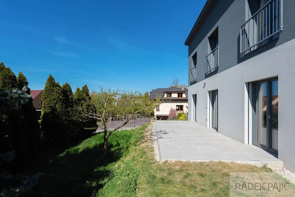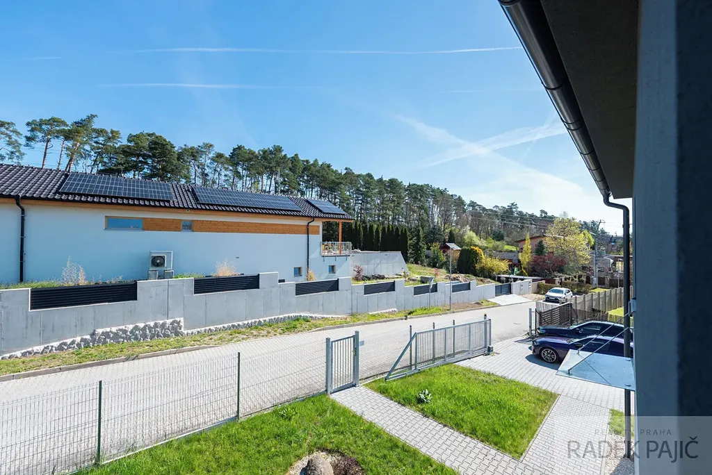 K dispozici jsou tři parkovací místa, elektrická vjezdová brána na dálkové ovládání, terasa ideální pro rodinné posezení i retenční nádrž na dešťovou vodu o objemu 4 m³. Samozřejmostí je zabezpečovací systém Jablotron a videotelefon s ovládáním vstupní branky, které zvyšují bezpečí celé rodiny.