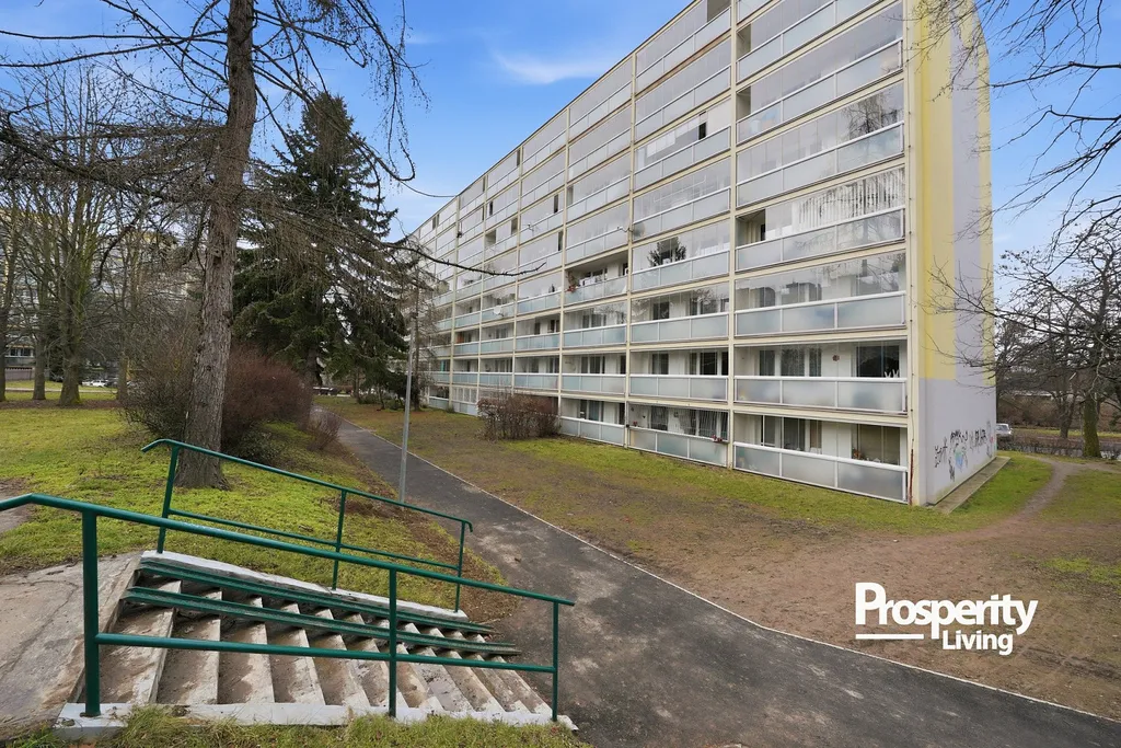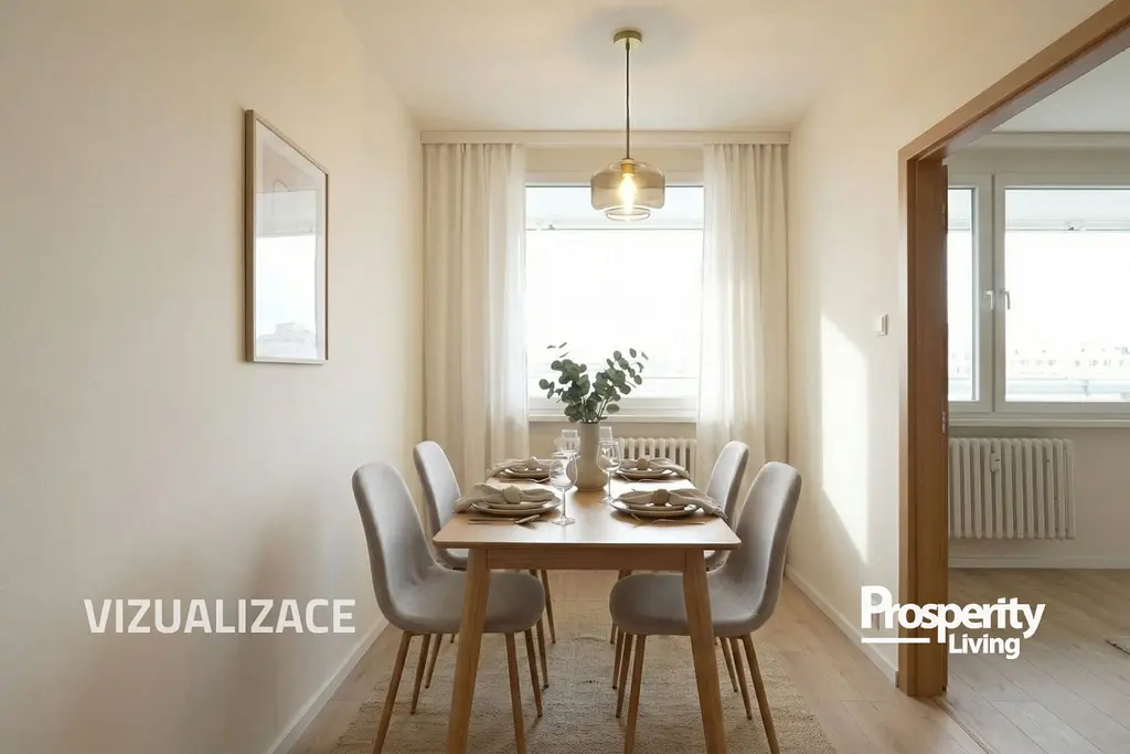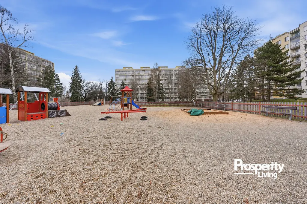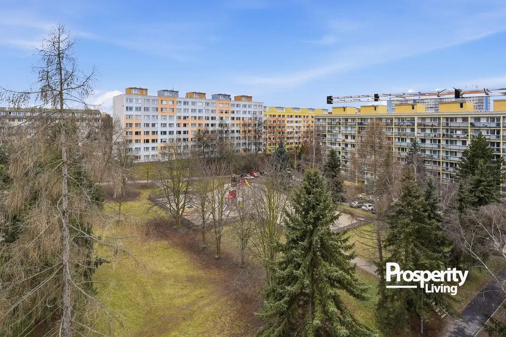 Kombinace zeleně, klidného prostředí a skvělé dopravní dostupnosti dává tomuto bytu to nejdůležitější – potenciál stát se skutečným rodinným domovem na mnoho let.