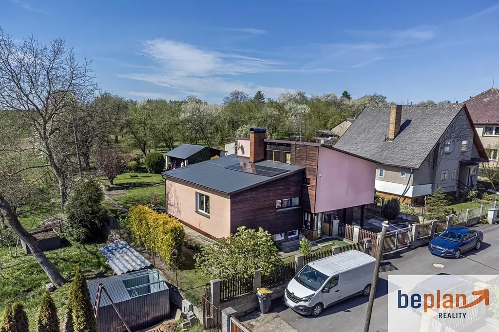 Dispozice domu je praktická a vzdušná. Ve zvýšeném přízemí se nachází otevřený obytný prostor s kuchyní a jídelnou, který tvoří přirozené srdce domova. Odtud vedou dřevěné schody do patra, kde najdete tři samostatné pokoje, koupelnu s vanou a oddělené WC. Podsklepení nabízí technické zázemí i dostatek úložných prostor.